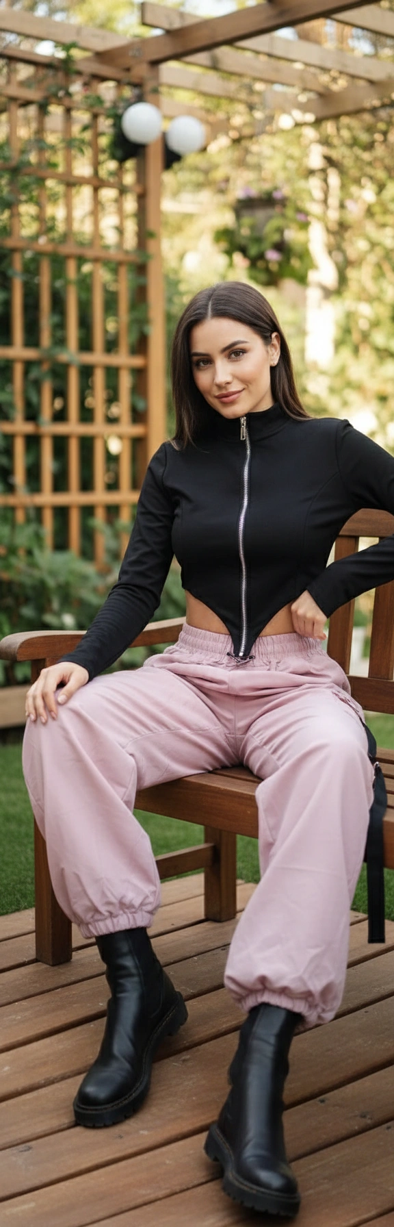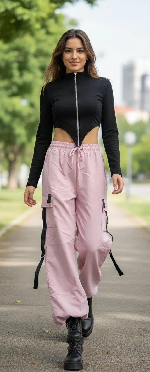 Parte inferior: pantalón tipo cargo/jogger en tono rosa palo, de tiro alto, holgado y con puños en los tobillos