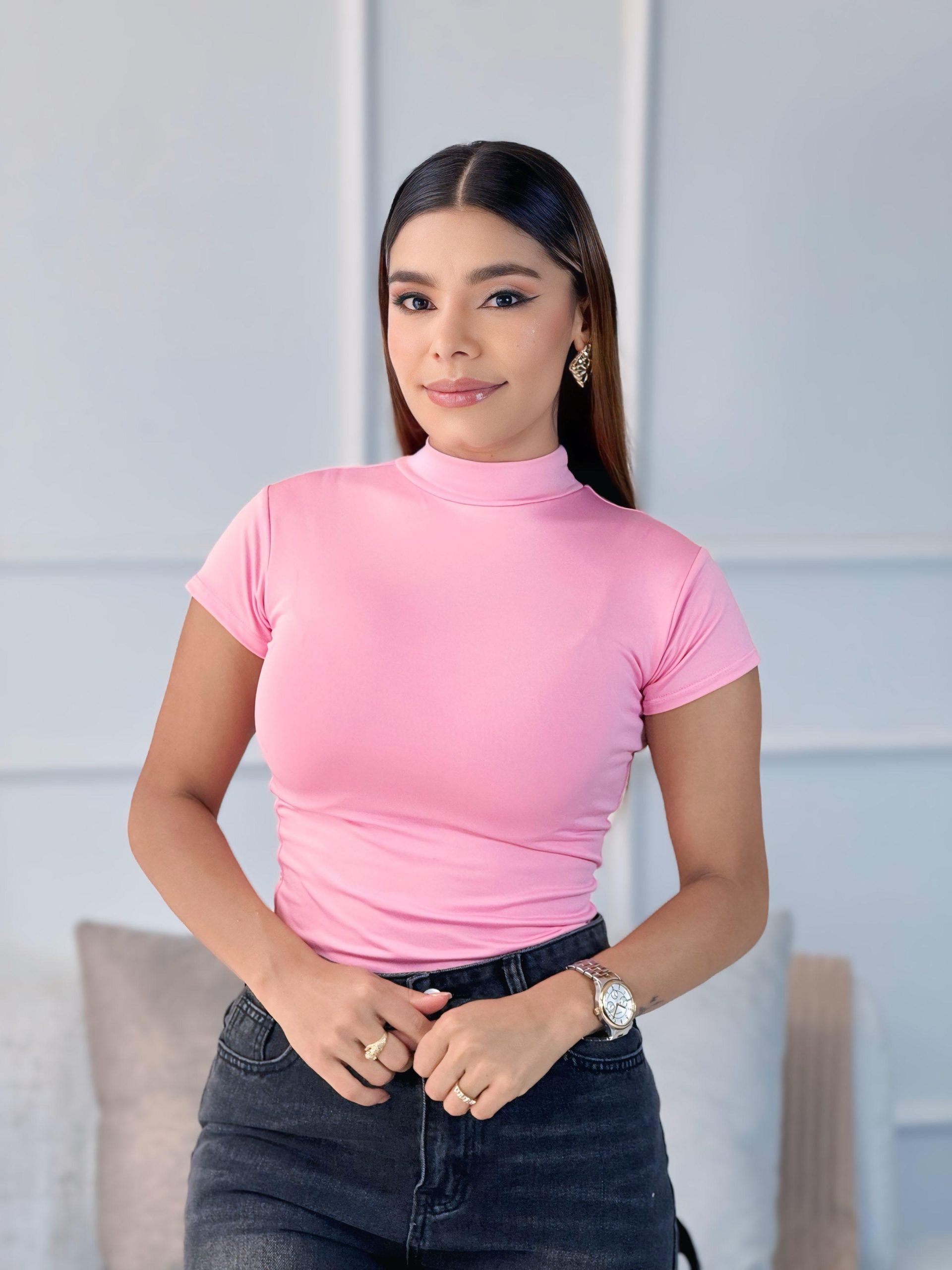 Este body rosa de cuello alto y manga corta es perfecto para crear looks frescos, elegantes o casuales. Su diseño limpio se ajusta al cuerpo resaltando la silueta con total comodidad.